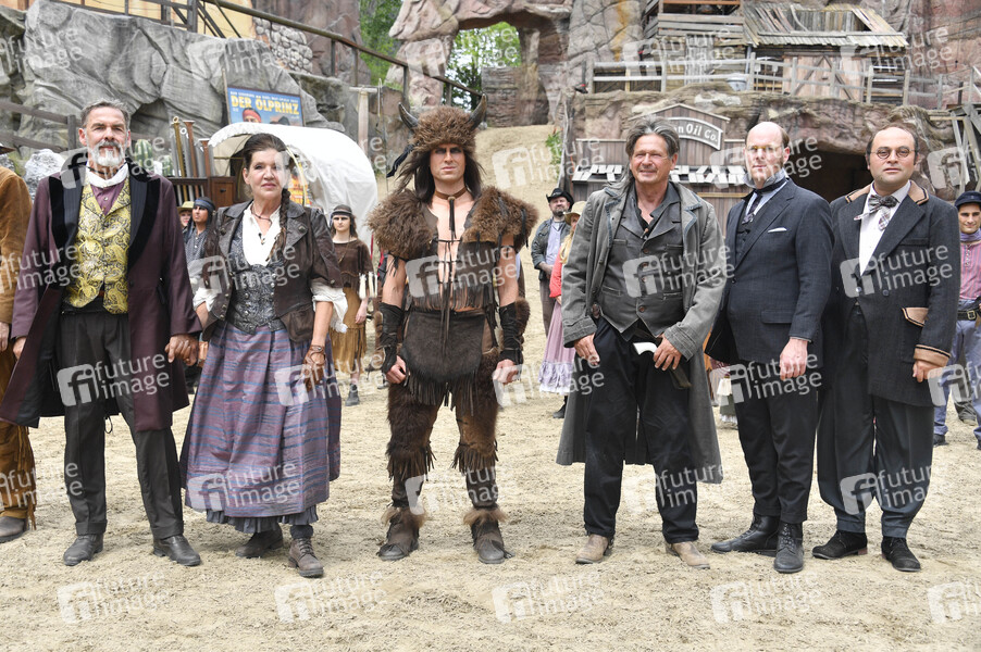 Sascha Hehn, Katy Karrenbauer, Fabian Monasterios, Joshy Peters, Stephan A. Tölle und Patrick L. Schmitz bei der Pressekonferenz der Karl-May-Spiele 2022 mit ersten Szenen aus 'Der Ölprinz' im Freilichttheater am Kalkberg. Bad Segeberg, 17.06.2022
