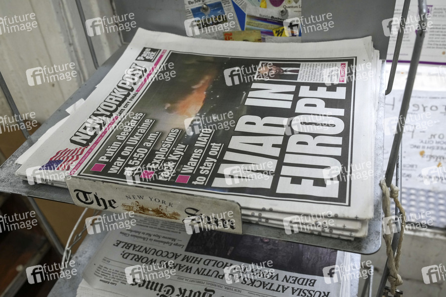 Schlagzeile der New York Post. Impressionen aus in NYC während der Ukraine-Russland-Krise. US-Präsident Joe Biden hat neue Sanktionen gegen Russland angekündigt und versprochen, dem Land 'verheerende Kosten' für seine Invasion in der Ukraine aufzuerlegen. New York, 24.02.2022