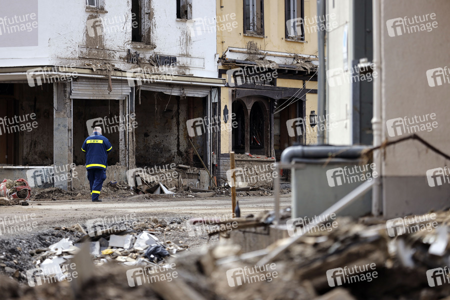 Nach dem Jahrhunderthochwasser in der Eifel durch heftige Regenfälle und Dauerregen mit Überschwemmungen und Überflutungen haben die Aufräumarbeiten im Ahrtal große Fortschritte gemacht. Einheiten von Polizei, THW, Bundeswehr und Feuerwehr mitsamt vielen freiwilligen Helfern haben Straßen geräumt, Schutt und Schlamm entfernt und die Menschen versorgt. Der Wiederaufbau wird trotzdem Jahre dauern. Im Bild Flutschäden in der Ortschaft Mayschoß, in der die Flut viele Häuser zerstörte, 08.08.2021
