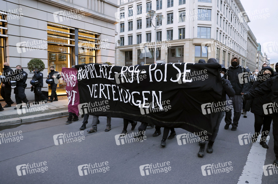 Etwa 2400 Demonstranten haben am Samstagabend unter dem Motto 'Køpi-Wagenplatzdemo: Don’t wait until it’s too late, this capitalist take over must stop!' an einer genehmigten Versammlung gegen die Räumung eines autonomen Wohnprojekts in der Köpenicker Straße 137 teilgenommen. Die Demo führte vom Gendarmenmarkt bis zum Rosenthaler Platz. Berlin, 15.05.2021