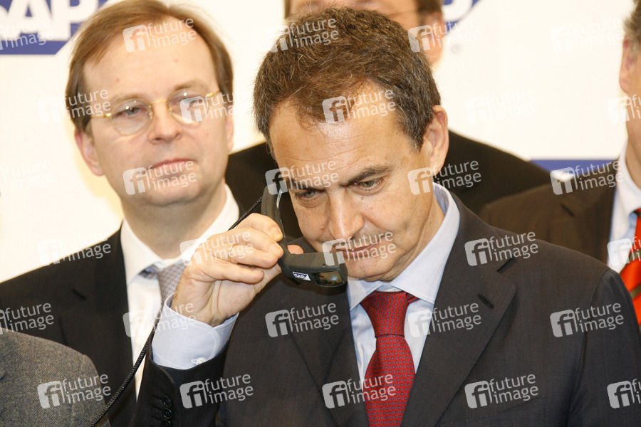 Eröffnungsrundgang von Bundeskanzlerin Merkel und Spaniens Ministerpräsident Zapatero auf der CeBIT 2010 (Centrum der Büro- und Informationstechnik), der weltgrößten Messe für Informations- und Computertechnik auf dem Messegelände in Hannover. Am Messestand von SAP.