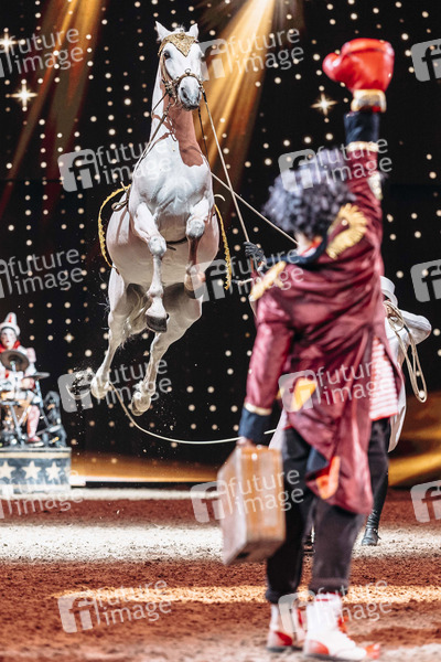 Pferdeshow 'Cavalluna - Grand Moments' mit Reitkunst, Aktobatik und Tanz in der Messehalle. Erfurt, 26.04.2025