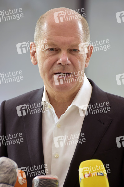 Olaf Scholz bei einem Statement nach einem Unternehmensbesuch bei der Merk KGaA im Innovation Center. Darmstadt, 26.08.2021