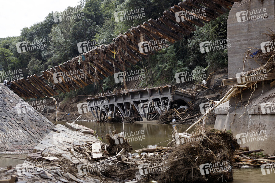 Nach dem Jahrhunderthochwasser in der Eifel durch heftige Regenfälle und Dauerregen mit Überschwemmungen und Überflutungen haben die Aufräumarbeiten im Ahrtal große Fortschritte gemacht. Einheiten von Polizei, THW, Bundeswehr und Feuerwehr mitsamt vielen freiwilligen Helfern haben Straßen geräumt, Schutt und Schlamm entfernt und die Menschen versorgt. Der Wiederaufbau wird trotzdem Jahre dauern. Im Bild Flutschäden an einer Brücke zwischen Rech und Mayschoß, die durch die Flut beschädigt wurde, 08.08.2021
