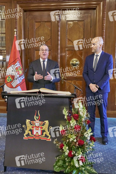 Boris Pistorius und Belit Onay beim Eintrag in das Goldene Buch der Stadt Hannover im Neuen Rathaus. Hannover, 12.11.2024