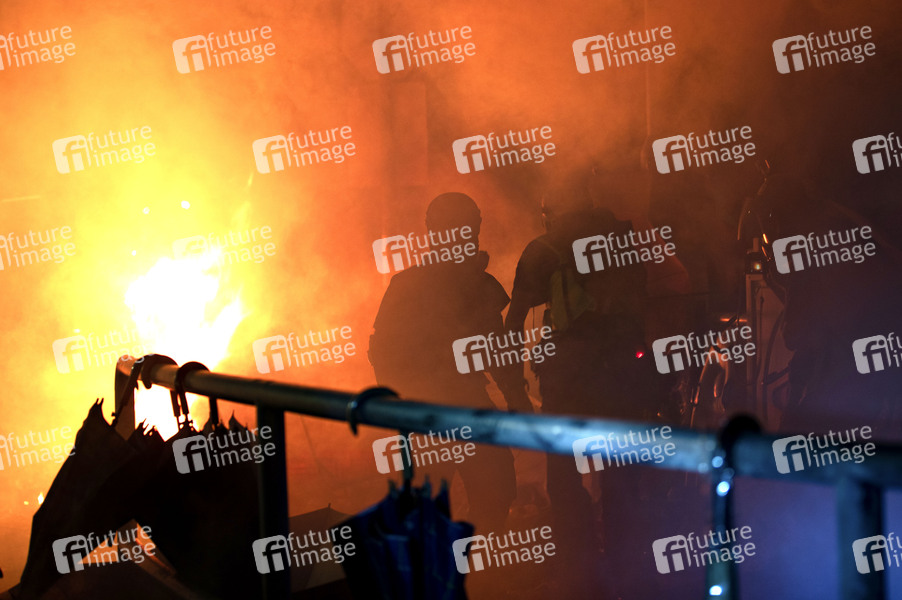 Studenten in Tränengaswolke - Kampf an der Chinese University Hong Kong (CUHK). Hongkong protestiert seit fünf Monaten ununterbrochen. Am Montag, dem 11. November 2019, begann ein Streik in der ganzen Stadt, der Teile von Hongkong zum Erliegen brachte, als MTR-Stationen geschlossen und mehrere Straßensperren errichtet wurden. Hongkong, 12.11.2019