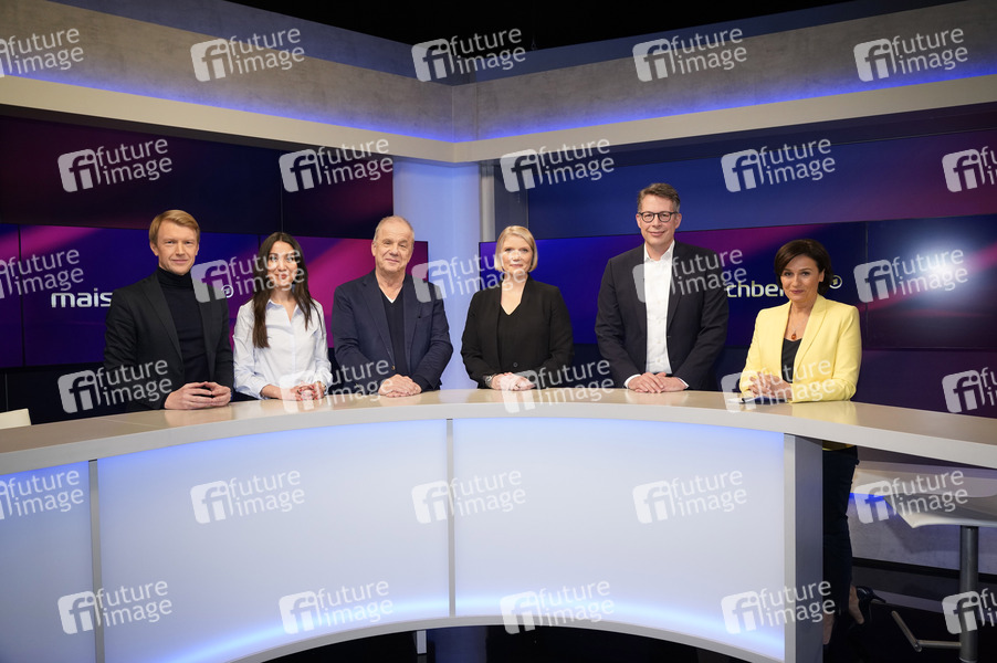 Markus Preiß, Alev Doğan, Hubertus Meyer-Burckhard, Cathryn Clüver Ashbrook, Markus Blume und Sandra Maischberger in der ARD-Talkshow 'maischberger' im Studio Berlin Adlershof. Berlin, 28.02.2024