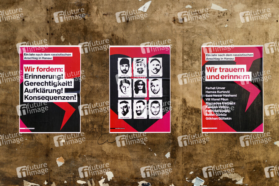 Plakate der Initiative 19. Februar Hanau erinnern an die Opfer des Hanau Attentat vor einem Jahr. Bis heute sind nicht alle Hintergründe aufgeklärt. Am 19. Februar 2020 kamen bei einem mutmaßlich rassistisch motivierten Attentat in Hanau neun Menschen vor und in zwei Shisha-Bars ums Leben. Später wurden ein Verdächtiger und seine Mutter tot aufgefunden. (Themenbild, Symbolbild)