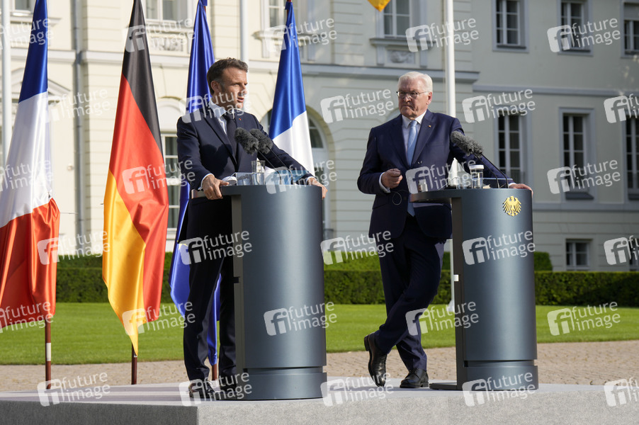 Emmanuel Macron und Frank-Walter Steinmeier beim gemeinsamen Pressestatement des Staatspräsidenten der Französischen Republik und des Bundespräsidenten im Schloss Bellevue. Berlin, 26.05.2024