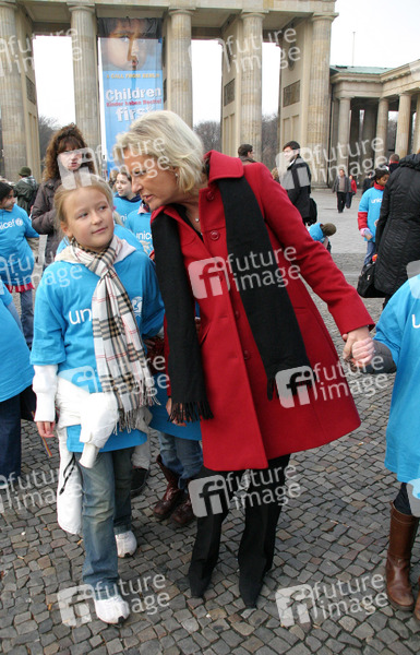UNICEF Fototermin mit Sabine Christiansen und 90 Schülern und Schülerinnen der Internationalen Schule Berlin vor dem Banner 'A Call From Berlin: Children First - Kinder haben Rechte' am Brandenburger Tor