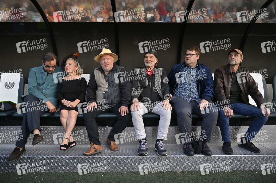 Jan Josef Liefers, ChrisTine Urspruch, Axel Prahl, Claus Dieter Clausnitzer, Björn Meyer und Jan Georg Schütte bei der Premiere des ARD-Krimis 'Tatort - Ein Freund, ein guter Freund' zum 20 jährigen Jubiläum des Münsteraner Tatorts im Preußenstadion. Münster, 30.08.2022