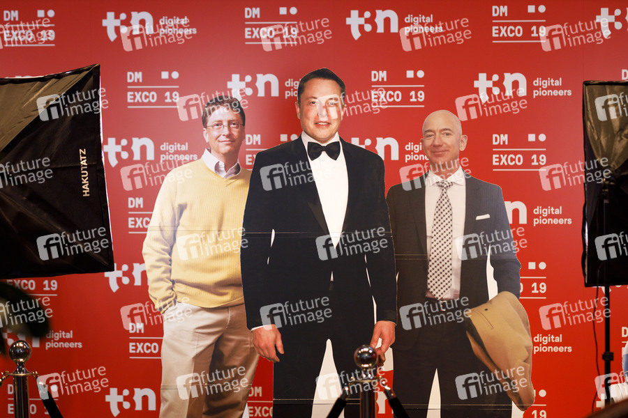 Aufsteller von Bill Gates, Elon Musk und Jeff Bezos am Stand von t3n auf der dmexco 2019 Fachmesse für digitales Marketing und Werbung auf der Koelnmesse. Köln, 11.09.2019