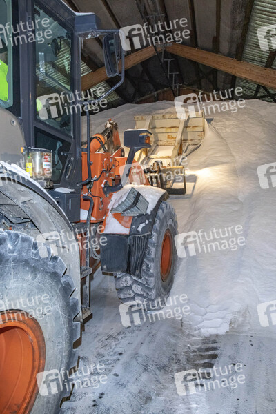 Radlader in der Streusalzhalle beim Zusammenschieben des Streusalzes beim Fototermin mit freundlicher Genehmigung der BDL Leitung des Betriebsdienstes der Autobahnmeisterei Remscheid. Remscheid, 10.02.2021