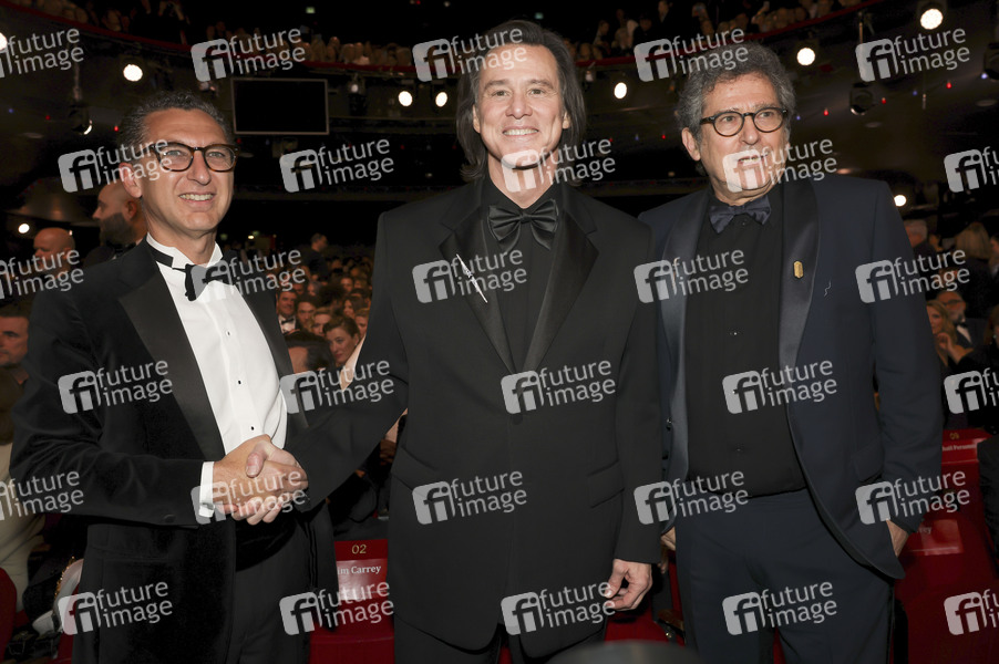 Maxime Saada, Jim Carrey und Gast mit dem Ehren-César bei der 51. César-Verleihung 2026 im Olympia-Theater. Paris, 26.02.2026