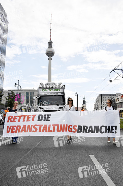 Mit einem Protestmarsch von derAlexanderstraße 3 zur Kundgebung am Bebelplatz, weisen Berliner Spielstätten, Veranstalter*innen, Techniker*innen, Bühnen- und Messebauer*innen, Außenwerber*innen, Security- und Gastropersonal sowie weitere Dienstleister*innen aus der Kultur- und Eventbranche auf ihre prekäre Lage und den eklatanten Mangel an Perspektiven hin. Berlin, 24.07.2020