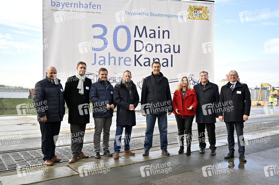 Joachim Zimmermann, Thorsten Glauber, Markus Söder, Melanie Huml, Christian Bernreiter und Jubiläumsgäste bei der Jubiläumsveranstaltung '30 Jahre Main-Donau-Kanal' am Bamberger Hafen. Bamberg, 25.11.2022