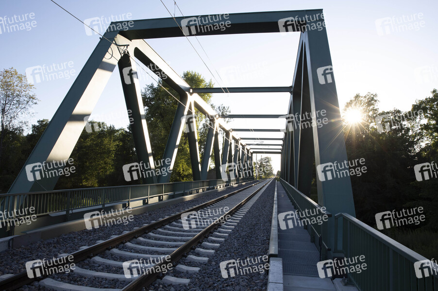 Oberleitungsträgerwerk an der neuen Argenbrücke an der Ausbaustrecke der neu elektrifizierten Südbahn im Teilabschnitt von Friedrichshafen nach Lindau. Lindau, 01.07.2020