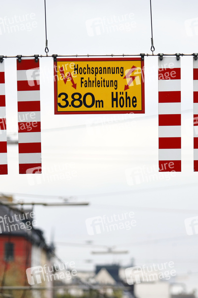 Hochspannung, Oberleitung, Fahrleitung, Strom, Lichtbogen, Warnschild, Warnhinweis, Idiotenbrücke, Fahrzeughöhe, maximale Höhe, maximale Durchfahrtshöhe, steckengebliebener LKW, Abmessungen von Kraftfahrzeugen, Unfallgefahr, Untersagung der Weiterfahrt, Kollision, Höhe von LKWs, Fahrzeughöhe, Oberleitungsschaden, Sicherheitszuschlag, Engpass, Technischer Dienst, Eisenbahnbrücke, Bogenbrücke, Achsenbruch, Verkehrszeichen 265, Durchfahrtsverbot für höhere Fahrzeuge, Unterführung, Durchfahrt, Brücke, Versicherungspflicht, Fahrlässigkeit, Unfall, Autoversicherung, LKW stecken geblieben, Warnschild, Symbolbild, Symbolfoto