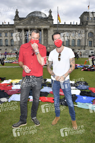 Sascha Vollmer und Alec Völkel von The BossHoss legen ihr letztes Hemd vor dem Reichstagsgebäude ab - Unter dem Motto #AlarmstufeRot protestieren Mitarbeiter der Kultur-und Veranstaltungsbranche in Berlin für Soforthilfen für die Veranstaltungswirtschaft. Durch die Schließungen und Absage von Veranstaltungen während der Corona-Pandemie stehen viele Kulturschaffende, Veranstalter, Messe- oder Bühnenbauer, Techniker und Kunstschaffende vor dem Aus. Berlin, 09.09.2020