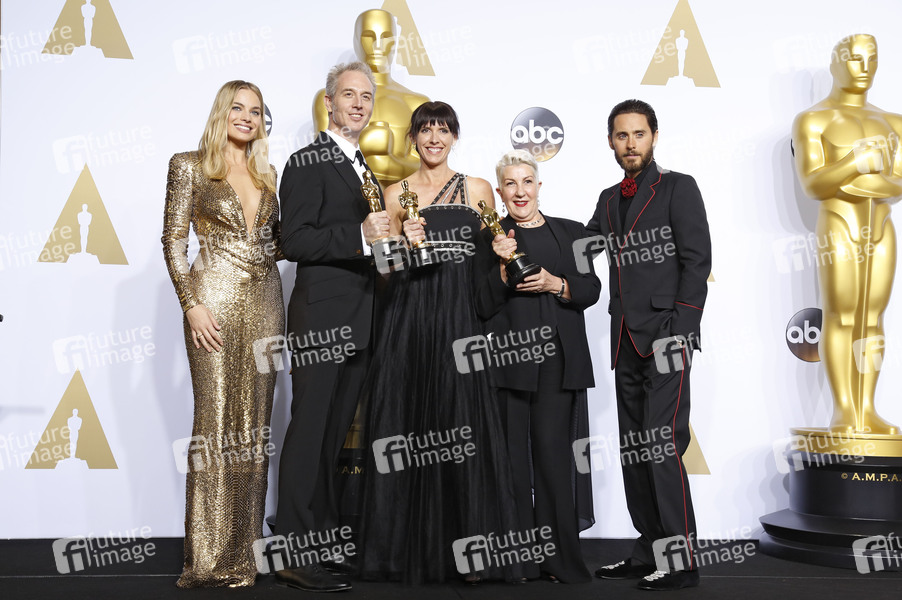 Margot Robbie mit Damian Martin, Elka Wardega und Lesley Vanderwalt (Bestes Make-up und beste Frisuren in 'Mad Max: Fury Road') und Jared Leto im Presseraum der Oscar Verleihung 2016 / 88th Academy Awards im Loews Hollywood Hotel. Los Angeles, 28.02.2016