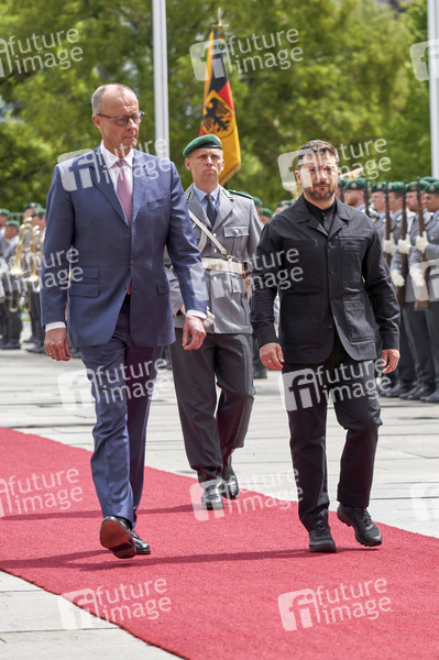 Friedrich Merz und Wolodymyr Selenskyj beim Empfang des Präsidenten der Ukraine mit militärischen Ehren und zu einem gemeinsamen Gespräch mit anschließendem Pressestatement im Bundeskanzleramt. Berlin, 28.05.2025