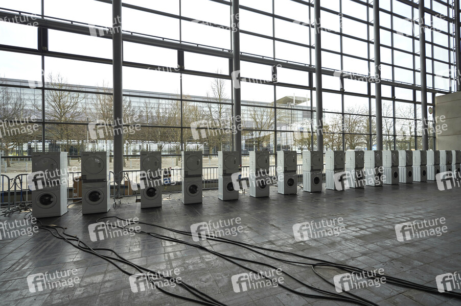 Waschmaschinen und Trockner - Zeltdörfer-Unterkünfte für ukrainische Kriegsflüchtlinge in der Halle 27 auf dem Messegelände, inklusive Wasch- und Duschmöglichkeiten, errichtet von der Feuerwehr Hannover. Die spätere Versorgung erfolgt durch das DRK. Hannover, 06.03.2022