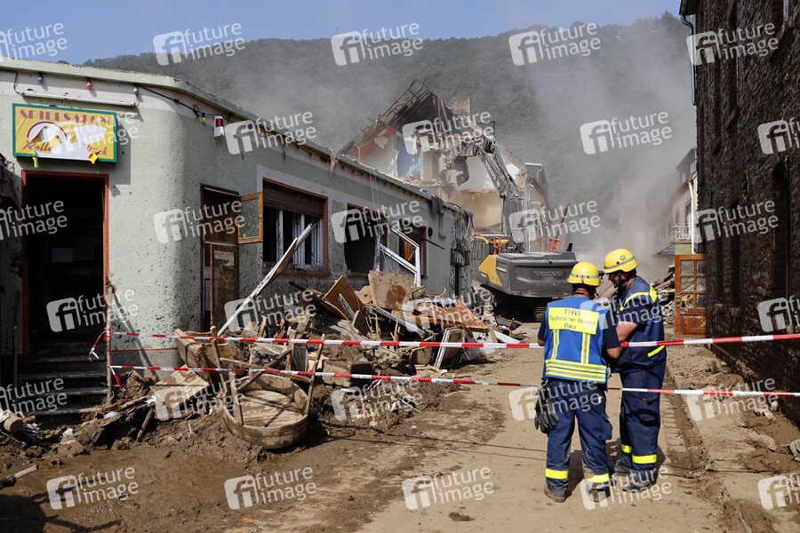 Nach dem Jahrhunderthochwasser in der Eifel durch heftige Regenfälle und Dauerregen mit Überschwemmungen und Überflutungen haben die Aufräumarbeiten im Ahrtal begonnen. Einheiten von Polizei, THW, Bundeswehr und Feuerwehr mitsamt vielen freiwilligen Helfern räumen Straßen, entfernen Schutt und Schlamm und versorgen die Menschen. Im Bild zerstörte Häuser in der Ortschaft Altenahr, in der die Flut viele Häuser zerstörte, 22.07.2021