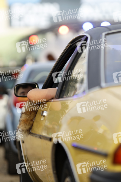 Ein Manta mit Fuchsschwanz und Ellenbogen aus dem Fenster im Autokino. Bonn, 27.06.2020