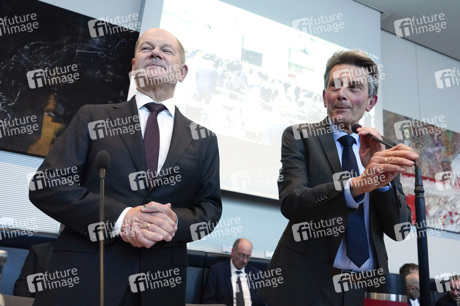 Olaf Scholz und Rolf Mützenich bei der Fraktionssitzung der SPD-Bundestagsfraktion im Reichstagsgebäude. Berlin, 08.10.2024