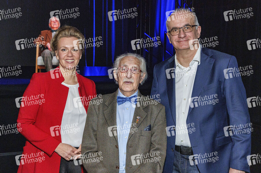 Ina Brandes, Leon Weintraub und Manfred Bayer beim Rundgang der Ministerin für Kultur und Wissenschaft des Landes Nordrhein-Westfalen durch die Ausstellung HOLO-VOICES in Halle 8 auf dem UNESCO-Welterbe Zollverein. Essen, 05.03.2026