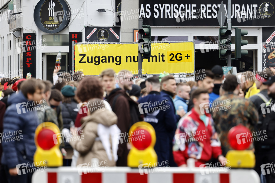 Karneval, Corona, Corona-Maßnahmen, 3G, 2G, 2G+, 3G+, 2G-Regel, 2G+-Regel, Delta-Variante, Omikron, Infektion, Infektionsgeschehen, Mindestabstand, Maskenpflicht, geimpft, genesen, getestet, Geimpfte, Genesene, Getestete, Covid, Covid19, Covid-19, Sars-Cov2, Virus, Viren, Infektionsschutzgesetz, Weiberfastnacht, Karnevalssaison, Corona-Lage, Inzidenz, Alaaf, Gastronomie, Sicherheit, Corona-Zahlen, Hotspot, Hotspots, Kontrolle, Besucher, Inzidenzzahlen, Superspreader-Event, Touristen, Ungeimpfte, ungeimpft, Corona-Impfung, Impfung, Infektionsrisiko, Festkomitee Kölner Karneval, 2G-Karneval, Dreigestirn, Narren, Tradition, Kultur, Brauchtum, Feiern, Schutz, Vorbeugung, Prävention, Corona-Karneval, Karnevalsfiguren, Tradition, Karnevalsgesellschaft, Brauchtum, Karnevalsgesellschaften, Rosenmontag, Zülpicher Straße, Quartier Latäng, Menschenmassen, Menschenmasse, Menschenmenge, überfüllt, Gedränge, dicht an dicht, Kontaktbeschränkungen, zwischenmenschliche Kontakte, Social Distancing, Schild, Brauchtumszone