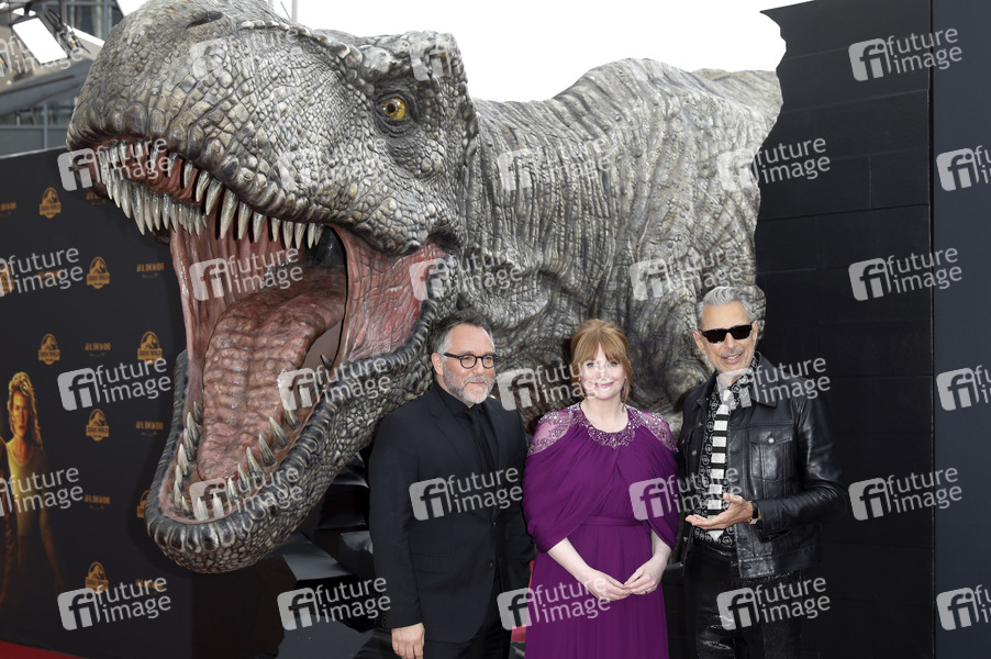 Colin Trevorrow, Bryce Dallas Howard und Jeff Goldblum bei der Premiere des Kinofilms 'Jurassic World: Ein neues Zeitalter / Jurassic World Dominion' im Cinedom. Köln, 30.05.2022