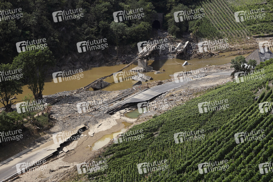 Nach dem Jahrhunderthochwasser in der Eifel durch heftige Regenfälle und Dauerregen mit Überschwemmungen und Überflutungen haben die Aufräumarbeiten im Ahrtal begonnen. Einheiten von Polizei, THW, Bundeswehr und Feuerwehr mitsamt vielen freiwilligen Helfern räumen Straßen, entfernen Schutt und Schlamm und versorgen die Menschen. Im Bild die zerstörte Bahnstrecke und Straße bei der Ortschaft Rech, in der die Flut viele Häuser zerstörte, 22.07.2021