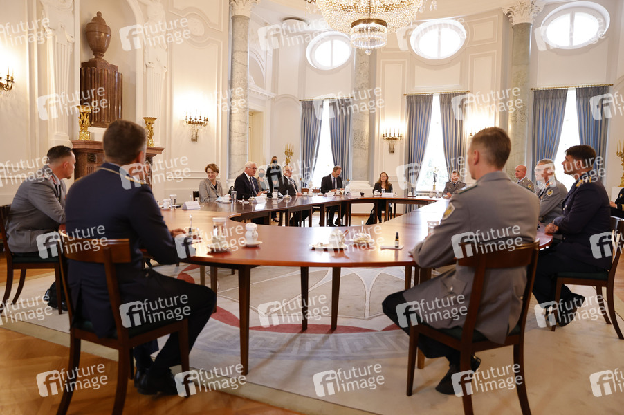 Frank-Walter Steinmeier und Ehefrau Elke Büdenbender beim Gespräch mit Brigadegeneral Jens Arlt und an der militärischen Evakuierungsoperation in Kabul und Taschkent beteiligten Soldatinnen und Soldaten im Schloss Bellevue. Berlin, 17.09.2021