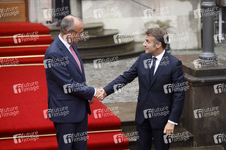 Friedrich Merz und Emmanuel Macron beim Empfang des französischen Staatspräsidenten zu einem gemeinsamen Gespräch in der Borsig-Villa am Tegeler See. Berlin, 23.07.2025