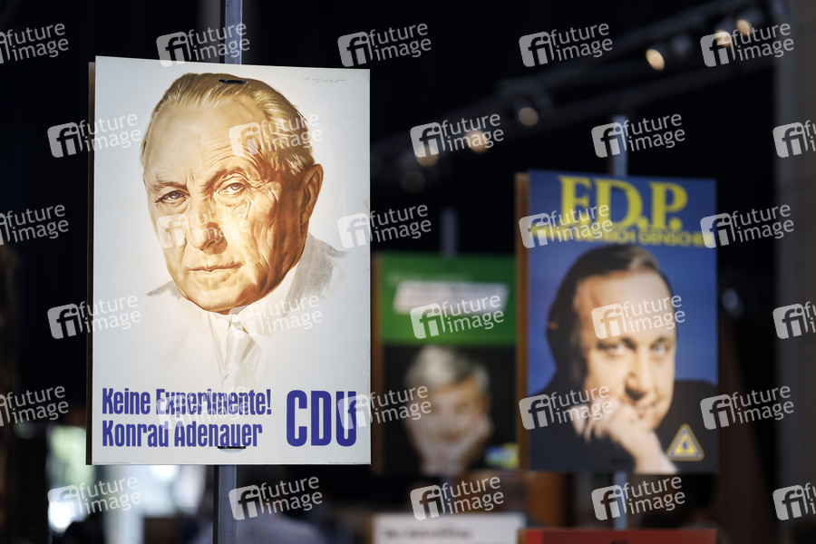 Konrad Adenauer, Keine Experimente, CDU, Hans-Dietrich Genscher, FDP, Ausstellung, Wahlen, Bundestagswahl, Landtagswahl, Kommunalwahl, Wahlen 2021, Wahlslogans, Wahlslogan, Wahlplakat, Wahlplakate, Wahlkampf, Wahlversprechen, Politik, Politiker, Wahlwerbung, Wahlen, Wählen, Demokratie, BRD, Bundesrepublik Deutschland, Geschichte, Ästhetik, Kunst, Politiker, Wählerbeeinflussung, Persuasion