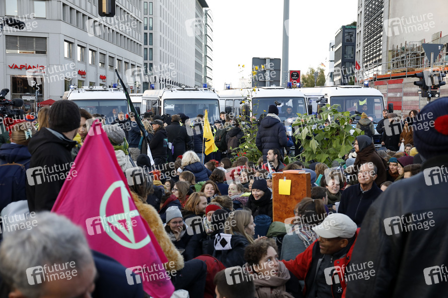 Aktivisten der Klimabewegung 'Extinction Rebellion' blockieren den Potsdamer Platz, die Polizei beginnt mit der Räumung. Berlin, 07.10.2019