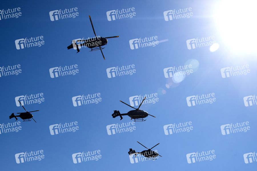 Militärhubschrauber bei der Zeremonie der Übergabe der Nationalflagge an die ACAVIET (Luftfahrtakademie der Armee) in der Helipuerto Base Coronel Mate. Colmenar Viejo, 07.05.2021