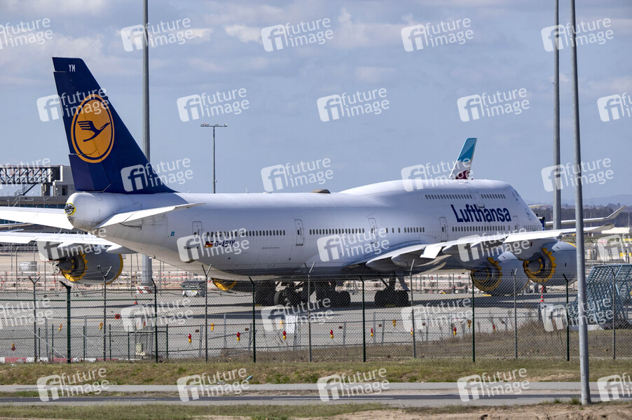 Abgestellte Lufthansa-Boeing 747 mit eingepackten Triebwerken als Folge des sehr starken Passagierrückganges in der Corona-Krise. Frankfurt, 03.04.2021