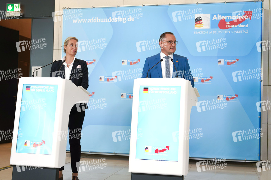 Politik, Statement, Pressekonferenz, PK, Reichstag, Deutscher Bundestag, Demokratie, Parlament, Parlamentsgebäude, Volksvertreter, MdB, Mitglied des Bundestages, Abgeordnete, Politikerin, Bundessprecherin der AfD, Abgeordneter, Politiker, Bundessprecher der AfD, Vorsitzende der AfD-Bundestagsfraktion