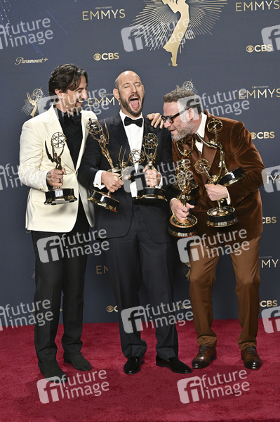 James Weaver, Evan Goldberg und Seth Rogen mit den Emmys für die beste Comedy-Serie 'The Studio' beim Preisträger-Photocall der 77. Primetime Emmy Awards 2025 im Peacock Theater. Los Angeles, 14.09.2025