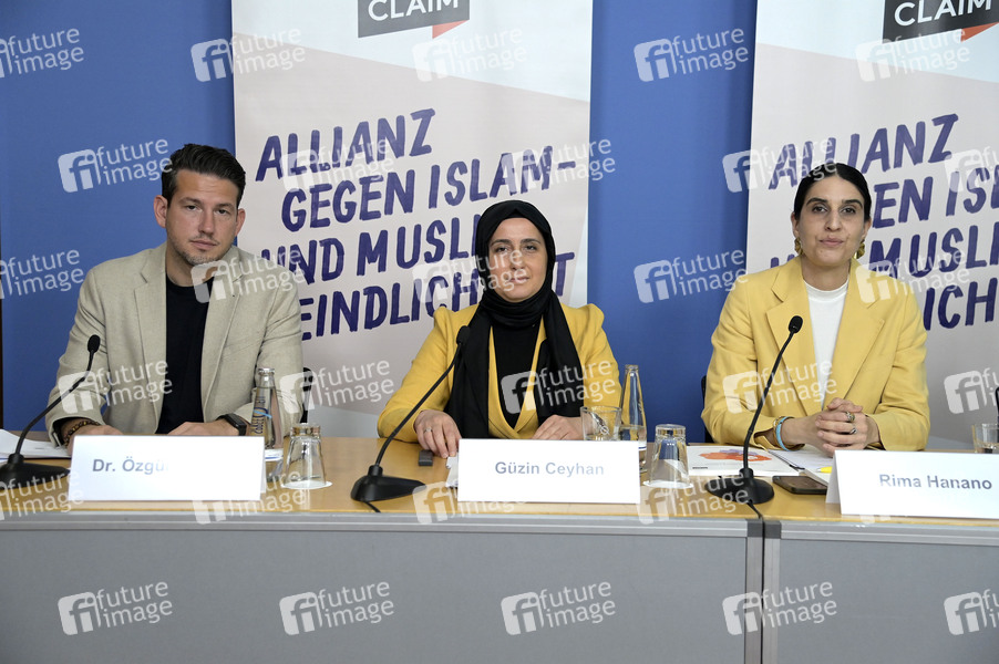 Özgür Özvatan, Güzin Ceyhan und Rima Hanano bei der CLAIM Pressekonferenz Veröffentlichung zivilgesellschaftliches Lagebild antimuslimischer Rassismus im Tagungszentrum im Haus der Bundespressekonferenz. Berlin, 24.06.2024