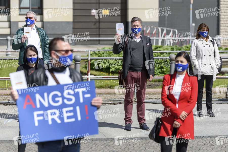 Mitglieder der Alternative für Deutschland (AfD), darunter Frank-Christian Hansel (Bildmitte), protestieren mit zwei Schweigekundgebungen nahe dem Brandenburger Tor gegen die Corona-Eindämmungsmaßnahmen. Berlin, 16.05.2020