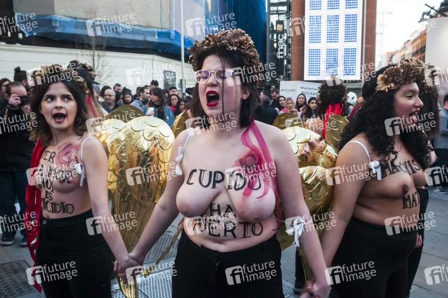 Femen Aktivistinnen bei einer Demonstration gegen Gewalt gegen Frauen am Valentinstag auf dem Plaza del Callao. Madrid, 14.02.2020