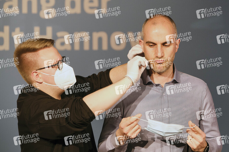 Belit Onay mit Tontechniker beim Wirtschaftsempfang 2021 der Landeshauptstadt Hannover, der coronabedingt digital stattfindet, mit dem Thema 'Umweltfreundliche Mobilität und Wirtschaft - ein Widerspruch?' in der Eilenriedhalle. Hannover, 19.04.2021