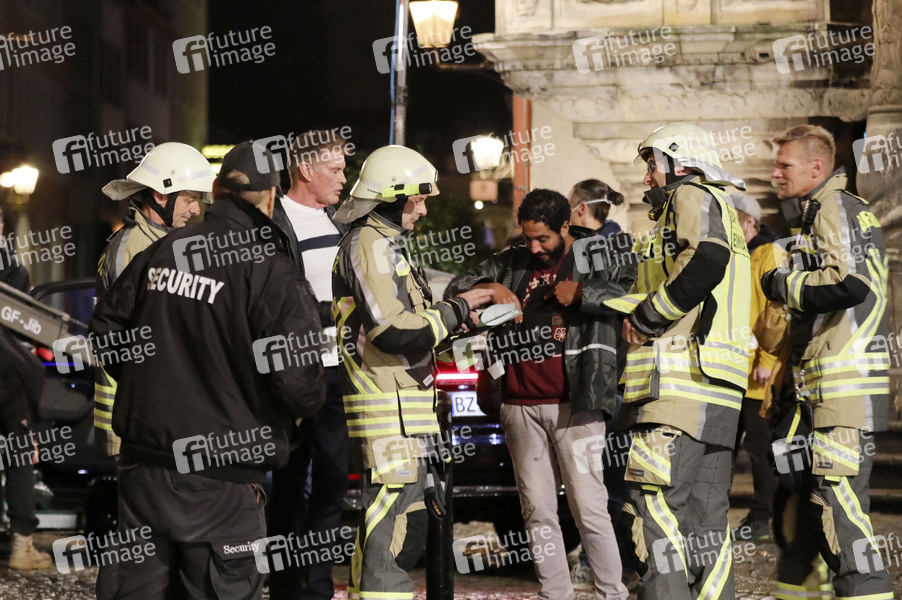 David Hasselhoff am Set zu Dreharbeiten für die TV Now Serie 'Ze Network' auf dem Untermarkt. Der Einsatz von Nebelmaschinen setzte die Brandmelder im Schlesischen Museum in Gang und löste einen nicht geplanten Großeinsatz der Görlitzer Feuerwehr aus. Zum Dank für ihren Einsatz ließ sich sich David Hasselhoff mit den Feuerwehrleuten fotografieren.. Görlitz, 05.10.2021