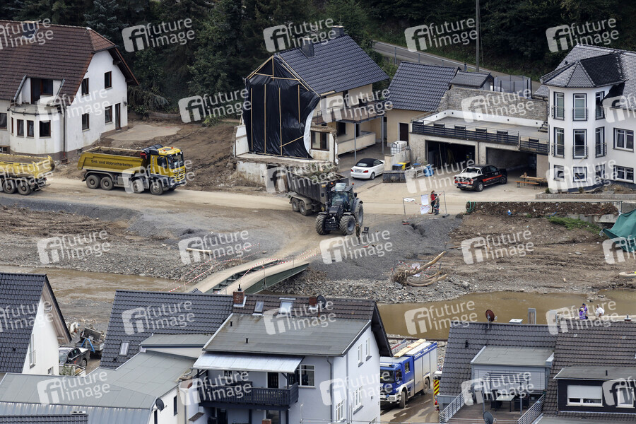 Nach dem Jahrhunderthochwasser in der Eifel durch heftige Regenfälle und Dauerregen mit Überschwemmungen und Überflutungen haben die Aufräumarbeiten im Ahrtal große Fortschritte gemacht. Einheiten von Polizei, THW, Bundeswehr und Feuerwehr mitsamt vielen freiwilligen Helfern haben Straßen geräumt, Schutt und Schlamm entfernt und die Menschen versorgt. Der Wiederaufbau wird trotzdem Jahre dauern. Im Bild Flutschäden in der Ortschaft Dernau, in der die Flut viele Häuser zerstörte, 08.08.2021
