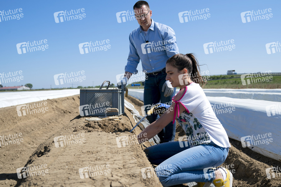 Saliha 'Sally' Özcan vom YouTube-Kanal 'Sallys Welt' mit Landwirt Hartmut Magin während eines YouTube-Drehs beim 17. Pfälzer Spargelstich unter besonderen Bedingungen wegen der Corona-Krise. Mutterstadt, 22.04.2020