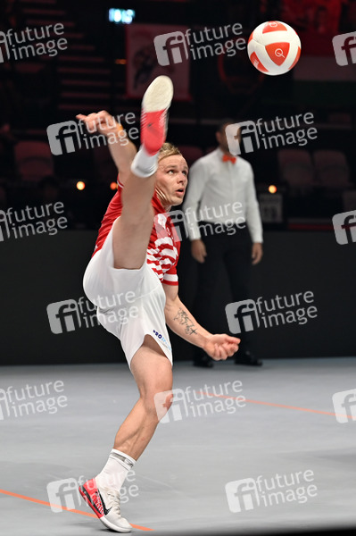 Adrian Duszak (Polen) beim Man Single Finale Rumanien vs Polen bei der Teqball Weltmeisterschaft 2022 in der Kia Metropole Arena. Nürnberg, 27.11.2022