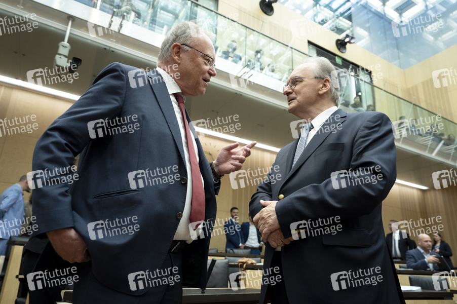 Stephan Weil und Reiner Haseloff in der 1053. Sitzung des Bundesrates im Plenarsaal des Preußischen Herrenhauses. Berlin, 11.04.2025
